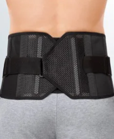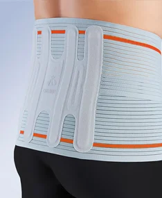 Corsé dorsolumbar con cinchas y almohadillas regulables para adaptarse a la altura del usuario. Permite liberar la tensión sobre los discos y ligamentos.